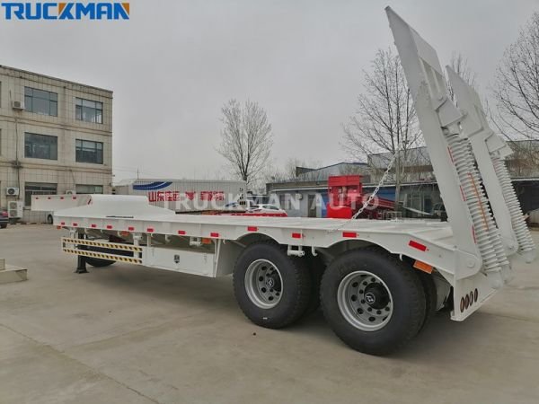 The 2 axle low bed trailer is also called the 2 axle lowbed trailer and the 2 axle lowboy trailer. It is used for standard-weight construction machinery, such as 20-ton excavators, 16-ton road rollers, etc., and the maximum loading capacity reaches 40 tons. The main parts of 2-axle low bed trailer include the axle, tire, support leg, tractor pin, steel, etc. These accessories support the operation of the low bed trailer. The steel of the low bed trailer has a manganese plate, and high-strength steel can even be optional wear-resistant steel.